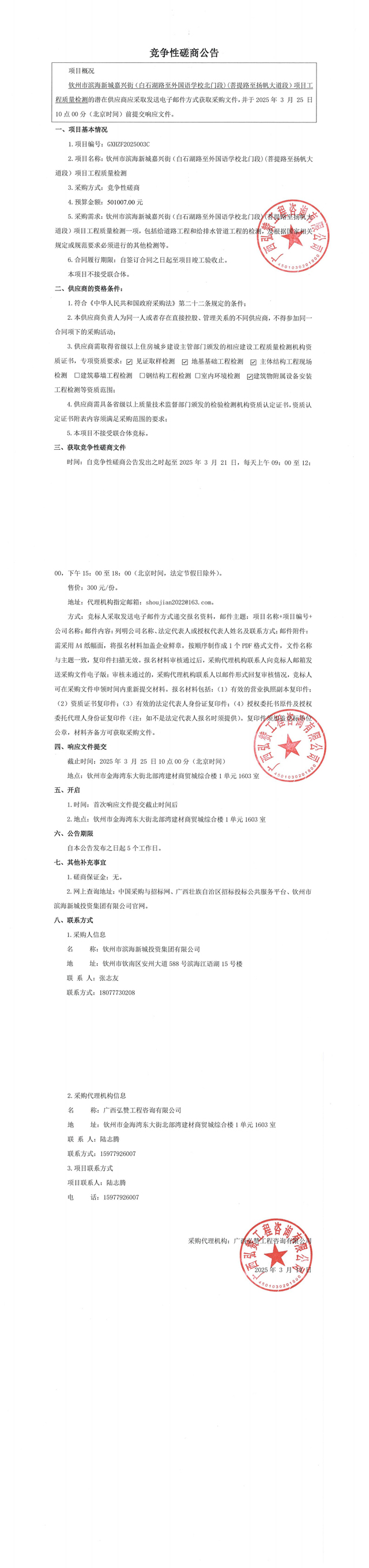 競爭性磋商公告-欽州市濱海新城嘉興街(白石湖路至外國語學校北門段)(菩提路至揚帆大道段)項自工程質量檢測