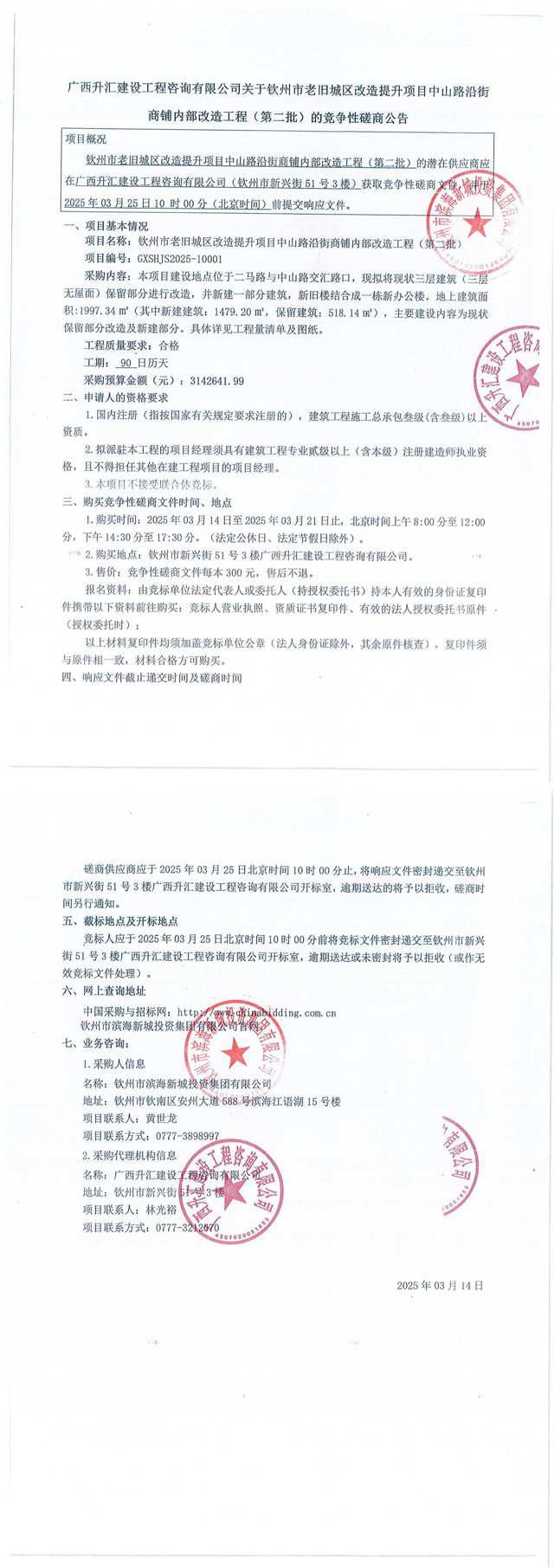 競爭性磋商公告-欽州市老舊城區改造提升項目中山路沿街商鋪內部改造工程(第二批)