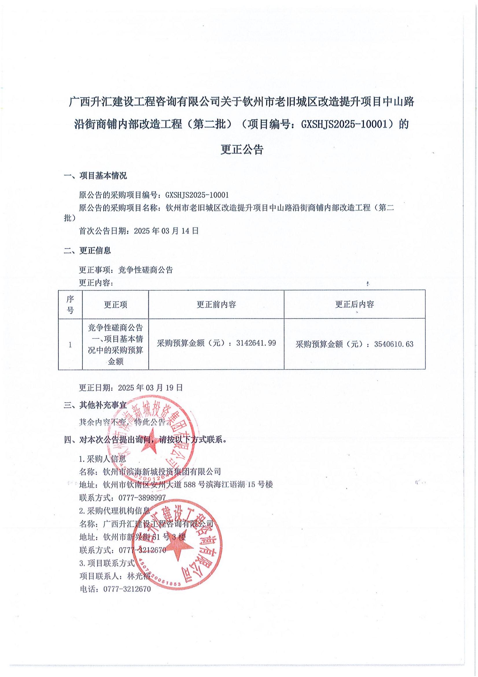 欽州市老舊城區改造提升項目中山路沿街商鋪內部改造工程(第二批)(項目編號:GXSHJS2025-10001)的更正公告