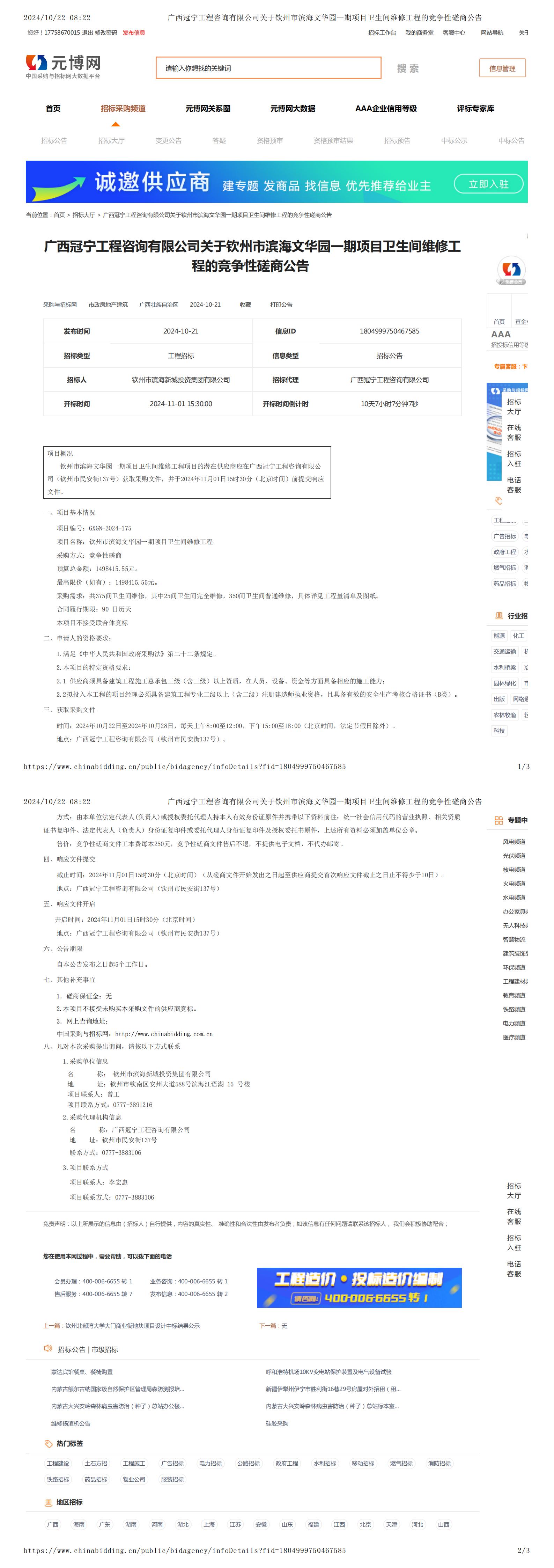 廣西冠寧工程咨詢有限公司關(guān)于欽州市濱海文華園一期項(xiàng)目衛(wèi)生間維修工程的競爭性磋商公告