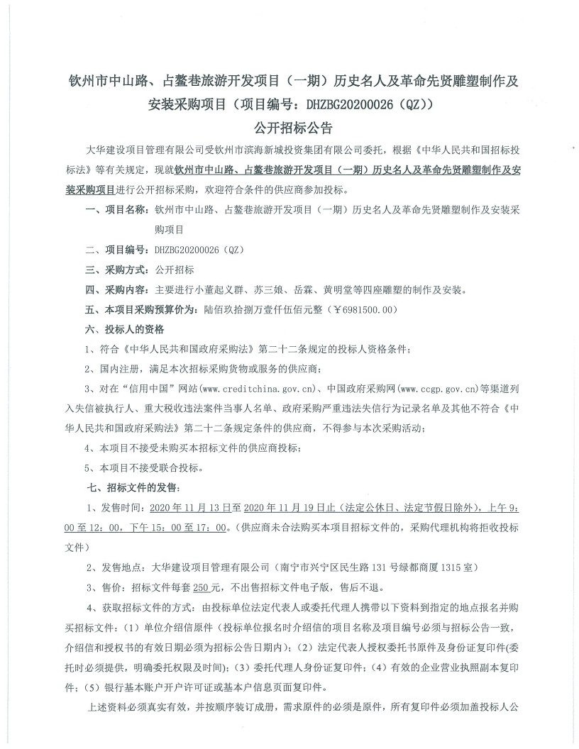 欽州市中山路、占鰲巷旅游開發項目(一期)歷史名人及革命先賢雕塑制作及安裝采購項目公開招標公告