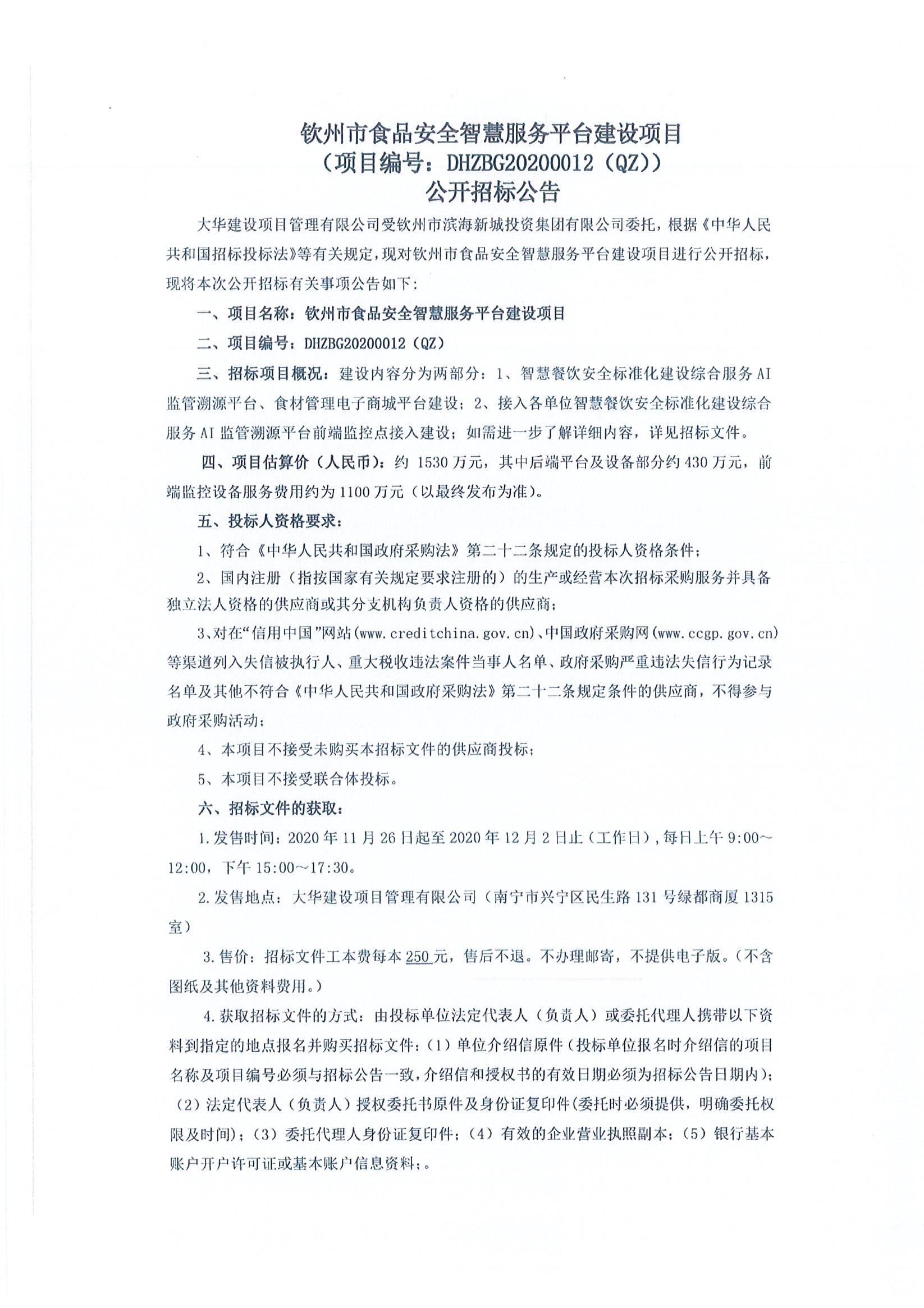 欽州市食品安全智慧服務平臺建設項目公開招標公告